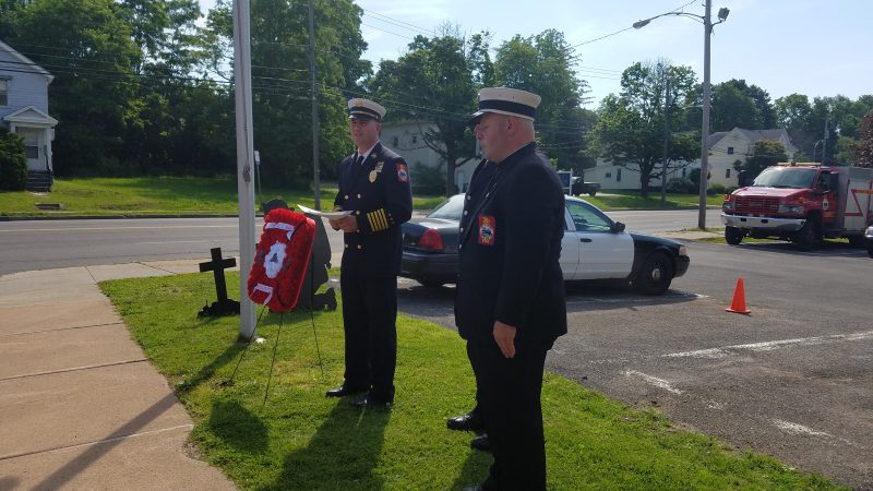 Incoming Chief David Eiffe, incoming Assistant Chief Shane Laws, and Department Chaplain Fr. John Canarro lead the ceremony at Fulton’s east side station.