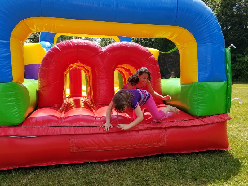 Young kids excitedly hurry out of the inflatable obstacle course.