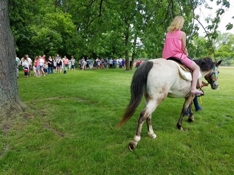 A long line forms as kids wait their turn to ride a horse.