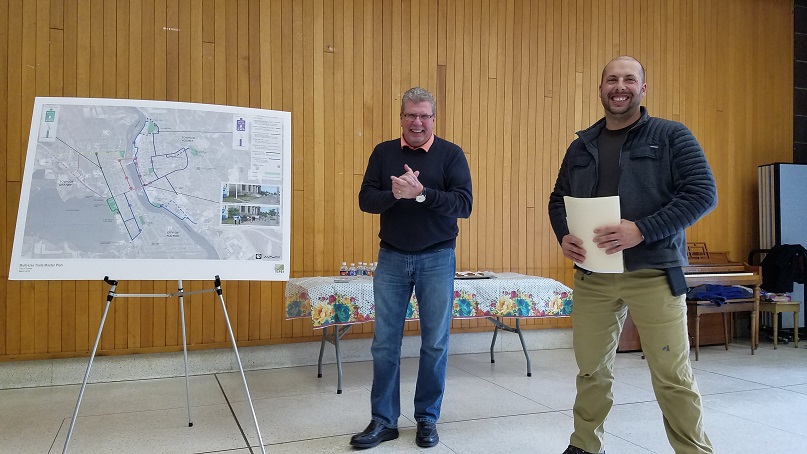 DPW Commissioner C.J. Smith (right) and Executive Director of the Fulton CDA Joe Fiumara (left) answer questions about Fulton’s incoming stairwell at Veterans Park.