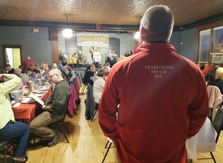Nick Duskee, former Fulton wrestler and owner of Chubbys Sports Bar and Grill, looks over the crowd at the first ever Fulton Wrestling Hall of Fame induction ceremony.