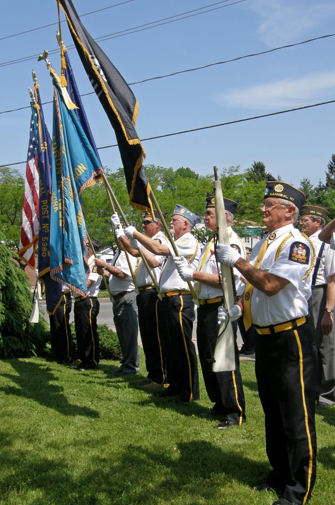 Members of Hannibal American Legion Post #1552 hold flags at the Memorial Day ceremony. From the right are Tom Somers (rifle,) Ivan Zukovsky (POW flag), Dan Mahaney (blue flag), and Brian Farrell (U.S. flag). Jim Terrinoni photo.