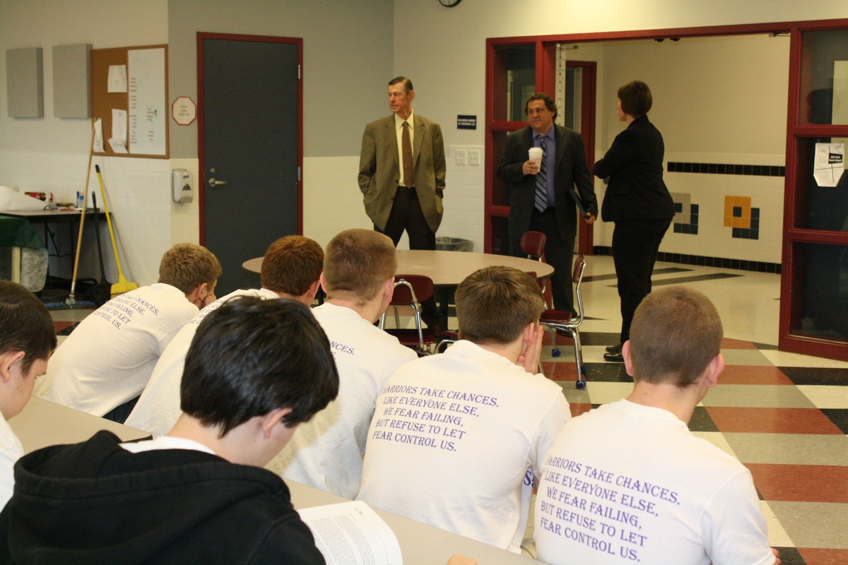 Hannibal Superintendent Mike DiFabio speaks to students as they wait for their meeting with state lawmakers. Board of Education President Dale Young is at left and district business official Nancy Henner is at right.