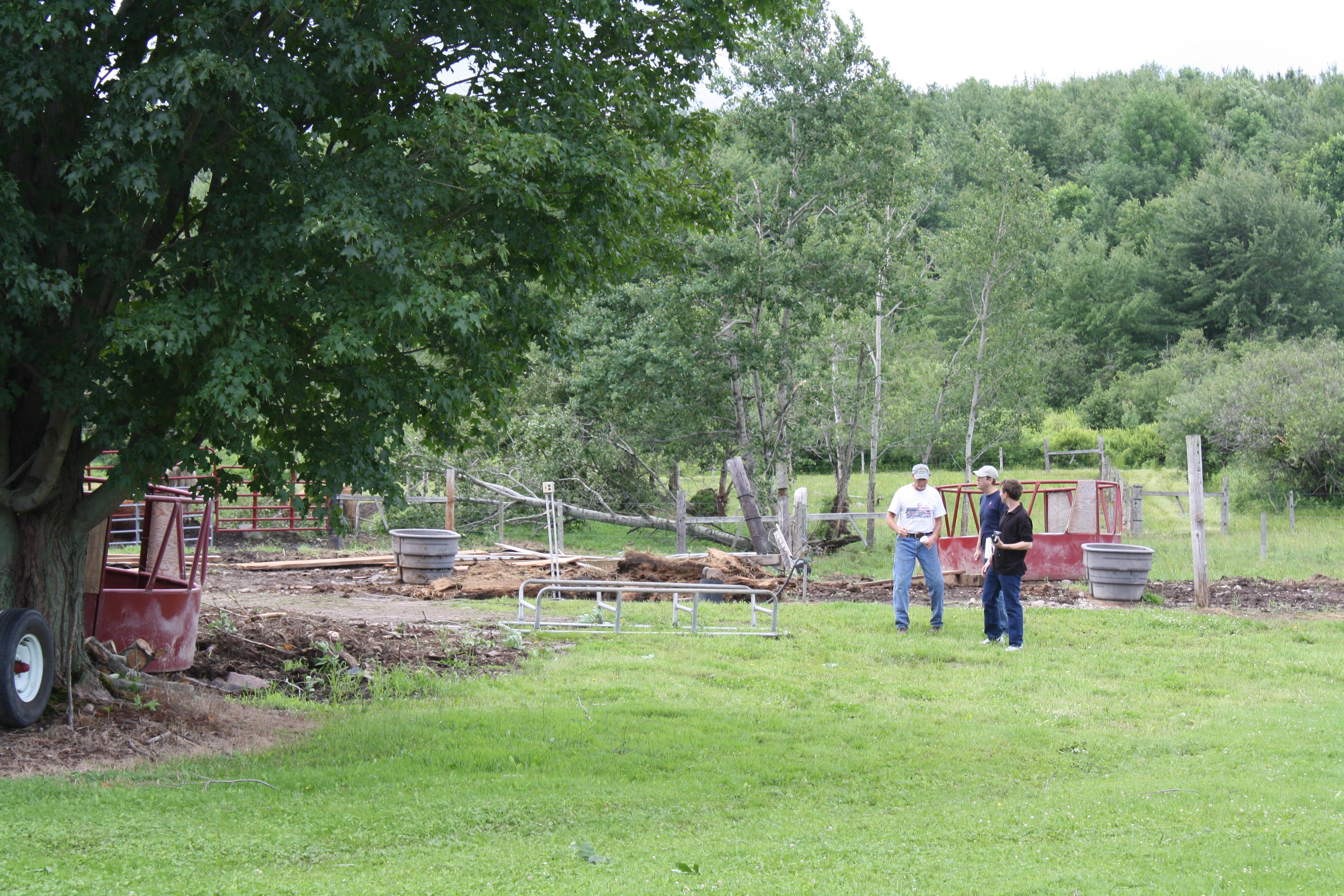 Farm owner Bruce Meldrim talks with meteorologists from the National Weather Service about the damage done by a tornado to his farm.