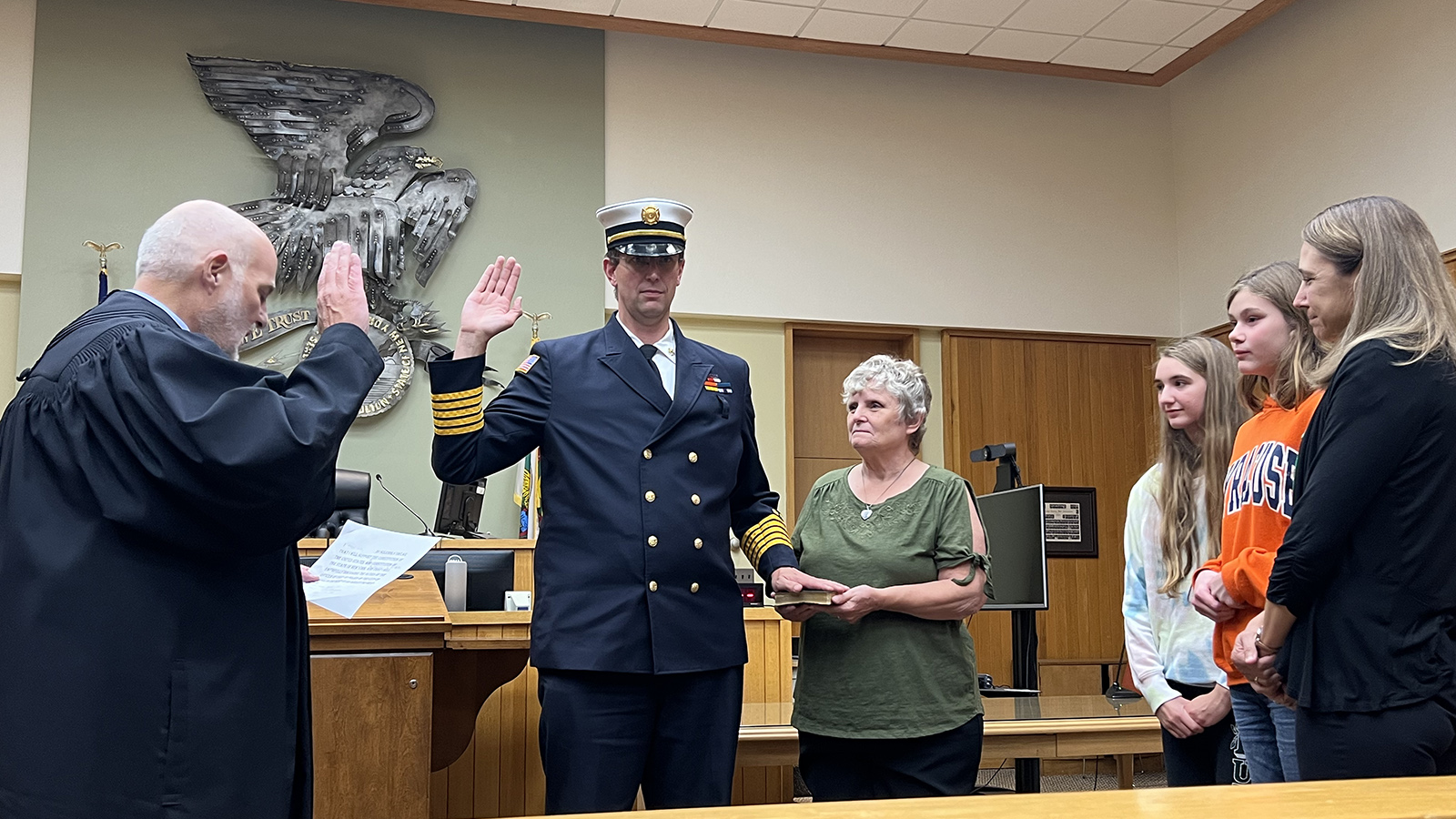 Judge Hawthorne swears in Adam Howard as Fire Chief. Photo by Kassadee Bradshaw.
