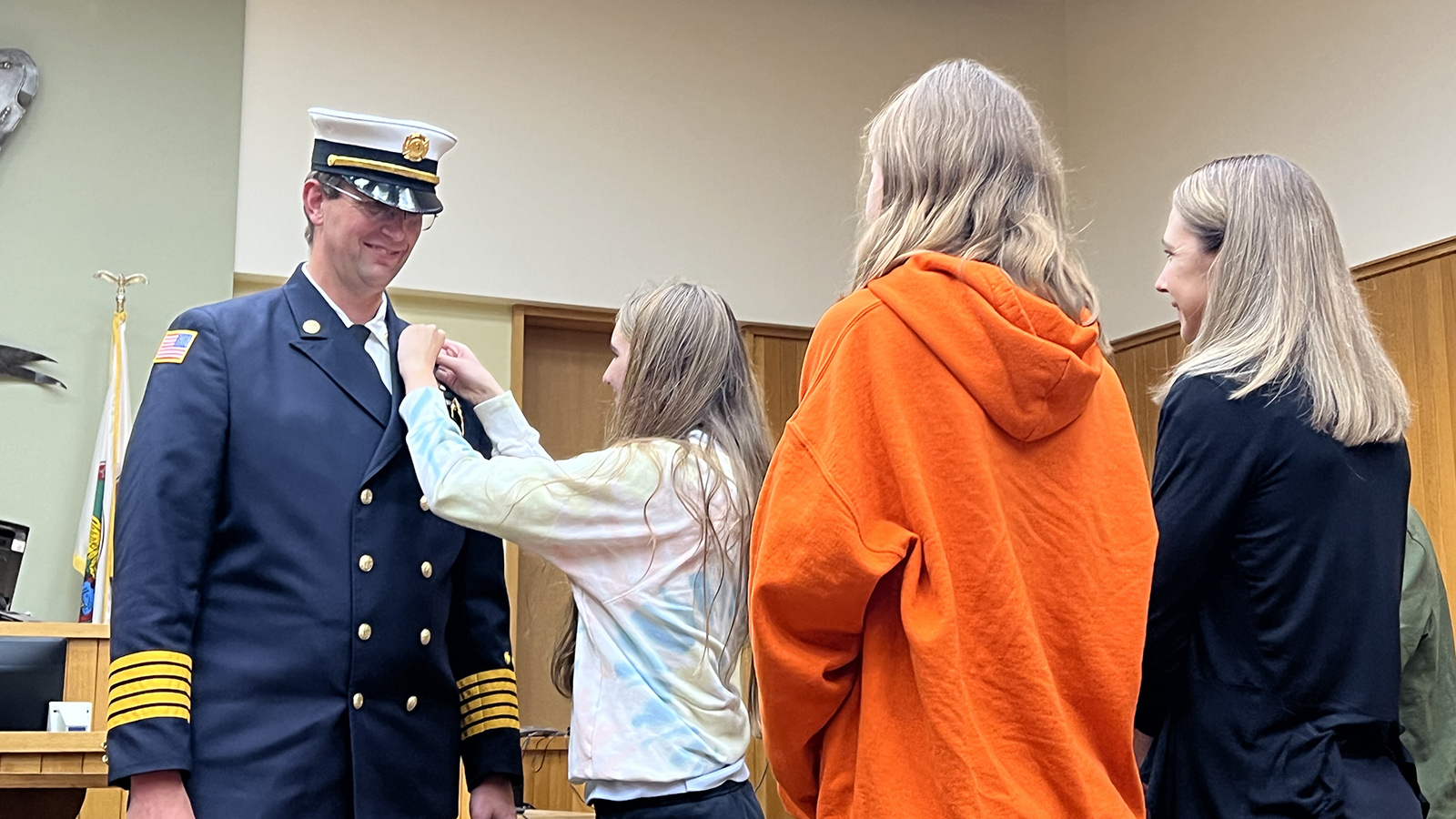 Adam Howard’s daughter attaches his pin during the swearing in ceremony. Photo by Kassadee Bradshaw.