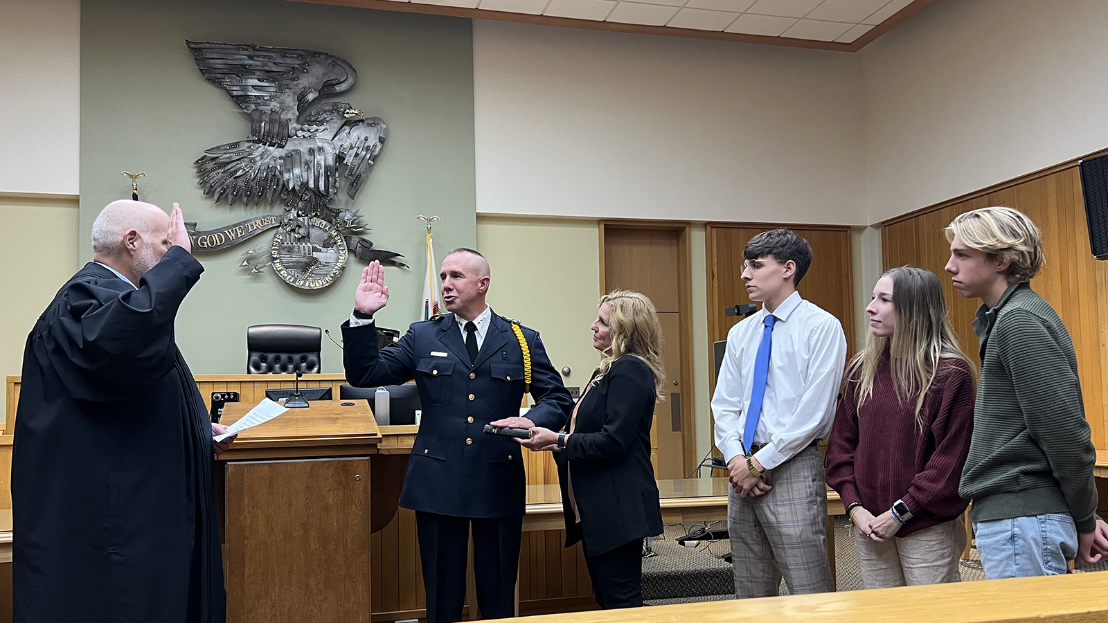 Judge Hawthorne swears in Michael Curtis as Police Chief. Photo by Kassadee Bradshaw.
