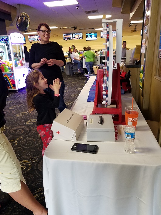 A young girl excitedly awaits her prize from the prize wheel.
