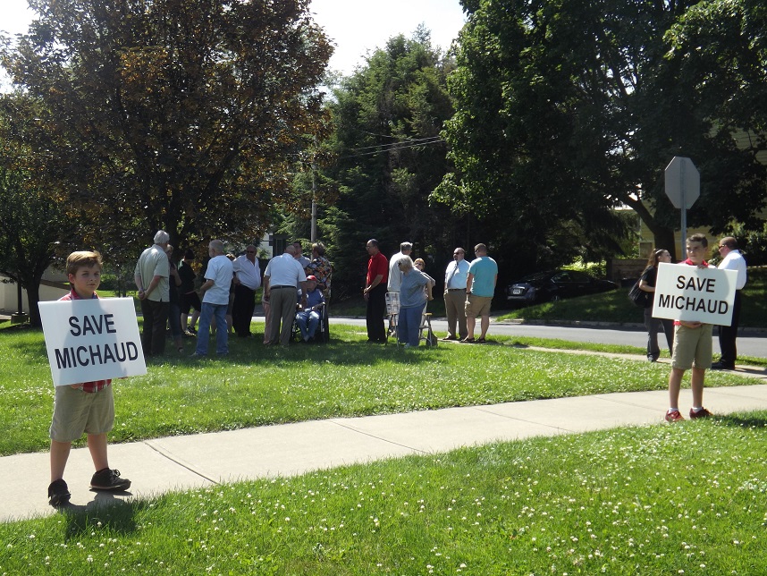 A group of concerned elected officials and community members rally outside of Michaud Residential Health Services.