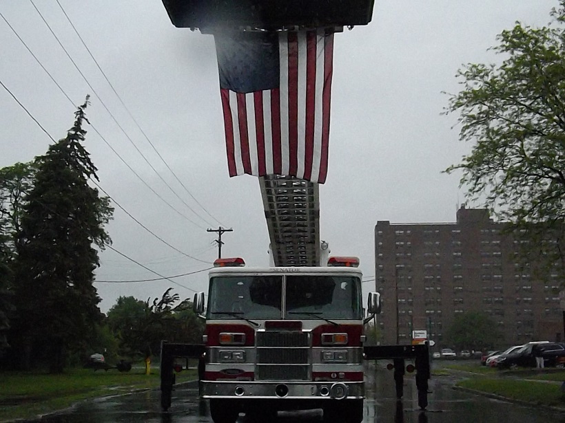 A Fulton Fire Department fire engine hangs the American flag outside of City Hall.