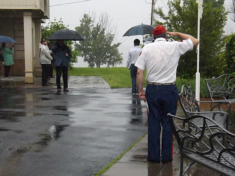 A veteran stands soaking wet in the rain to salute during the playing of Taps.