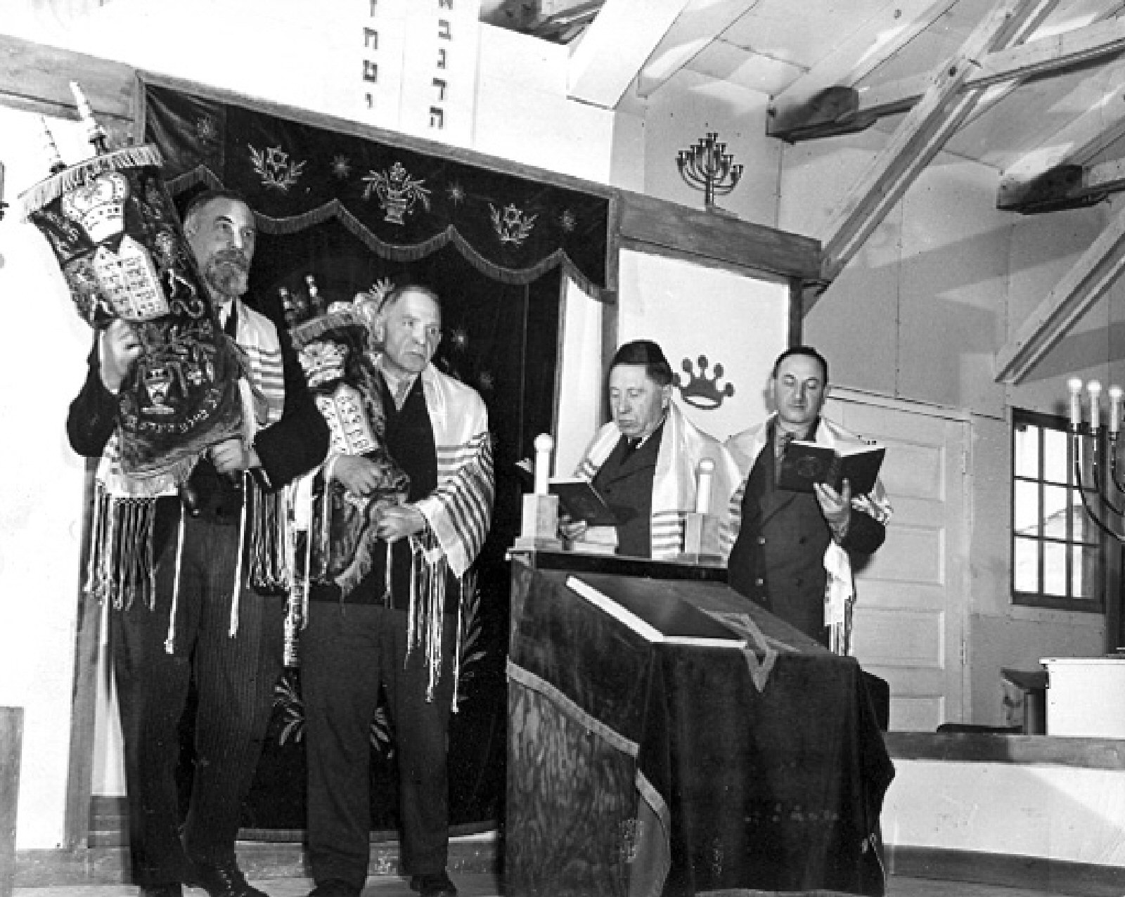 A service was conducted at the synagogue just outside the entrance of the old fort during the open house. Religious equipment was furnished by B’nai B’rith for Sephardic Jews and other groups. It was accepted by Rabbi Moses Tzechaval of Belgium and Rabbi Hazan, spiritual leaders from the refugees. Courtesy of the Beit Hatsuf Museum Collection in Israel.