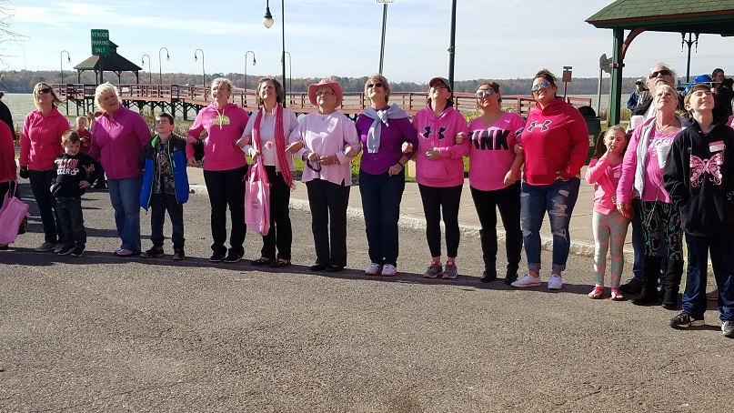 Guests stand arm in arm as they form a human pink ribbon for breast cancer awareness.