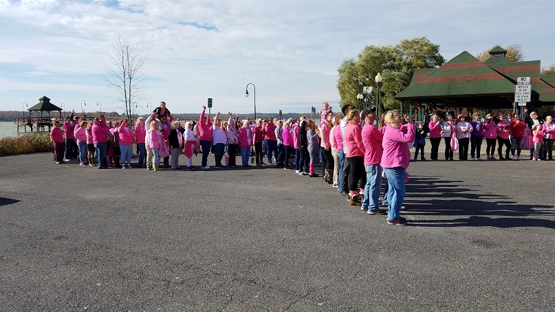 Guests form a human pink ribbon for breast cancer awareness.