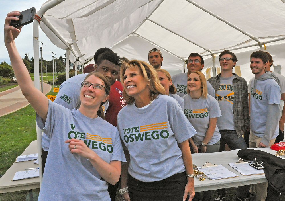 SUNY Oswego political science faculty member Dr. Allison Rank (front) — shown with college President Deborah Stanley and student volunteers during a nonpartisan Vote Oswego “blitz week” event on campus prior to the 2016 presidential election – has earned the national John Saltmarsh Award for Emerging Leaders in Civic Engagement from the American Democracy Project.