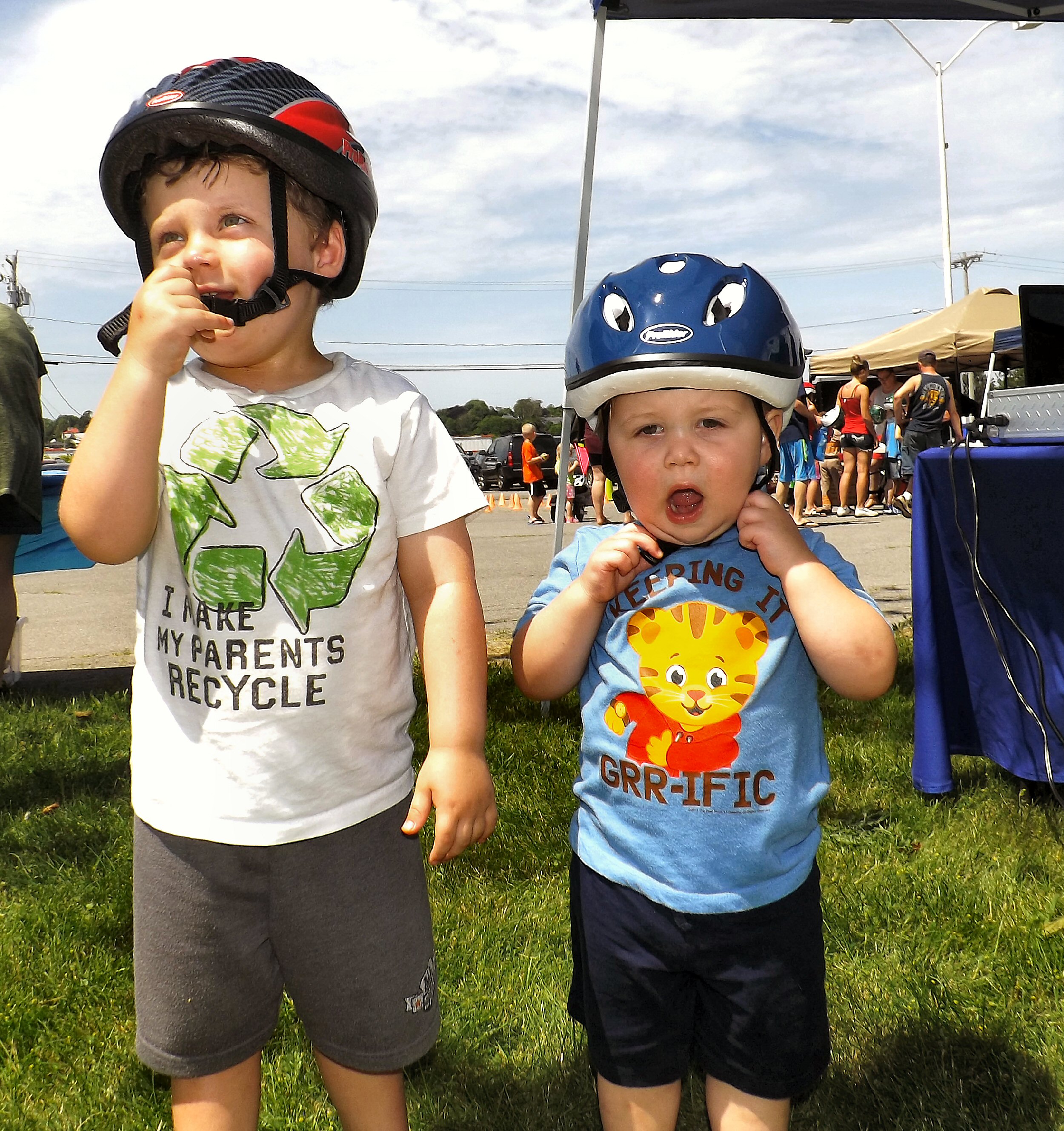 Griffin, left, and Grayson Pecora check out their new safety helmets.