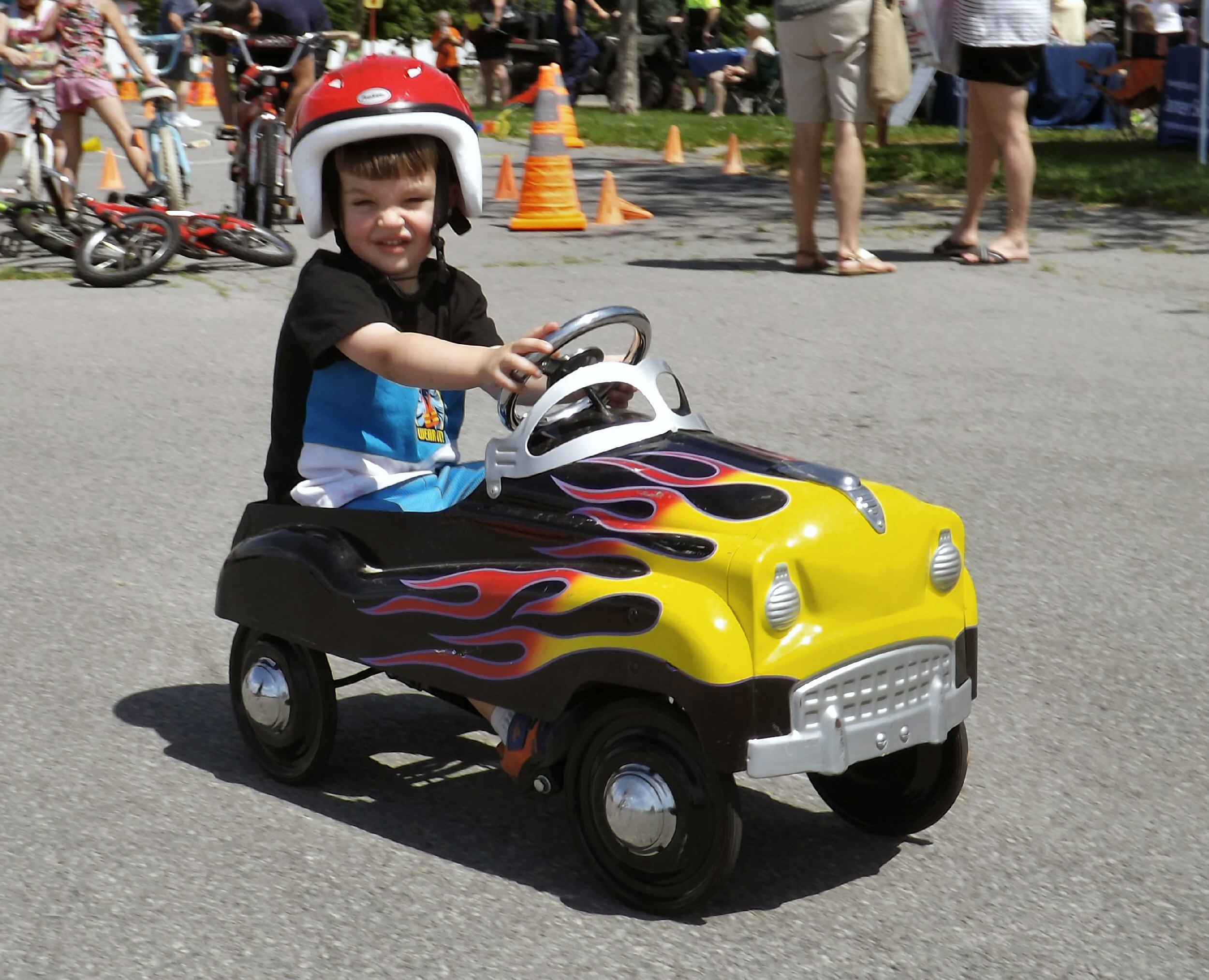 A youngster takes a spin in a miniature sports car.