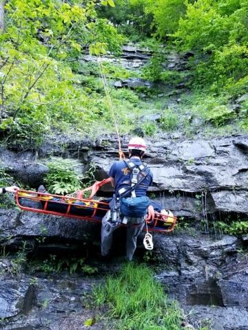 The team assisted Orwell VFD and Northern Oswego County Ambulance crews in recovering a patient with a broken leg in the lower falls area of the gorge.