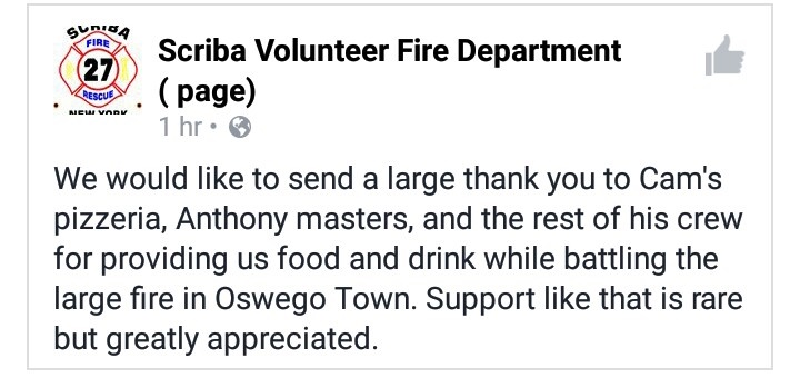 Scriba Volunteer Fire Department thanks Cam’s Pizzeria, Anthony Masters and his crew for providing food and drink while battling the fire.
