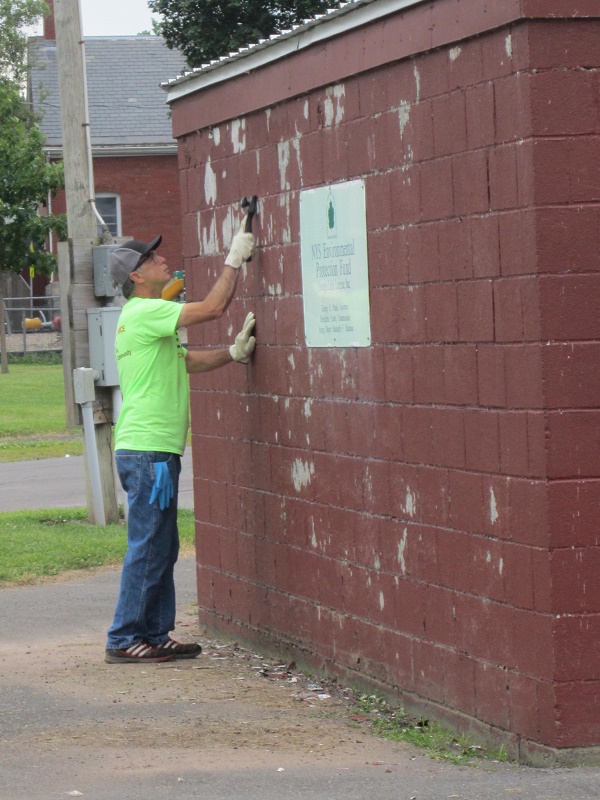 Exelon volunteers revamp the dugouts of Fort Ontario baseball fields.