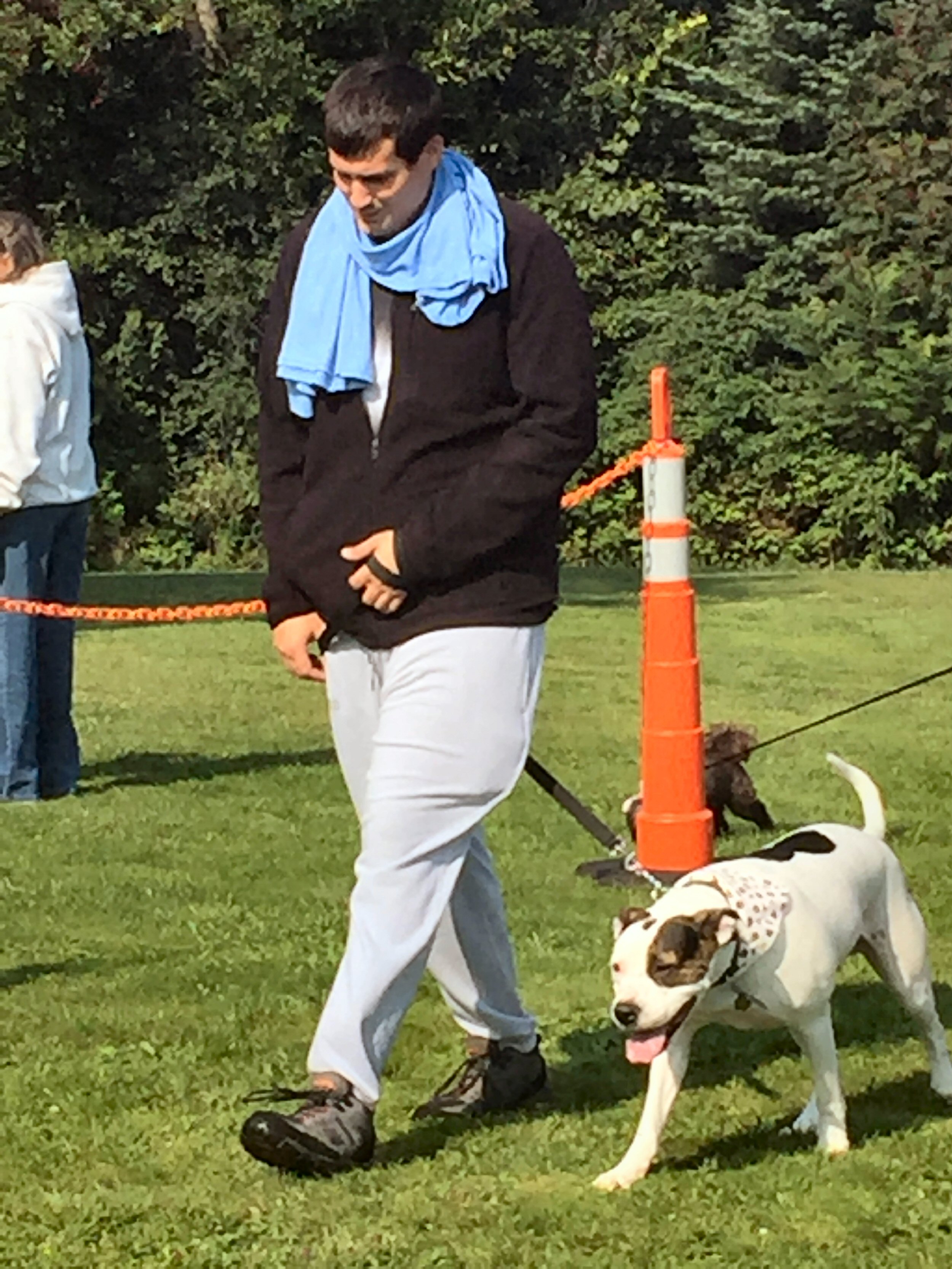 Joe Amedio and his dog Moose walk the rest of the way to the finish line.