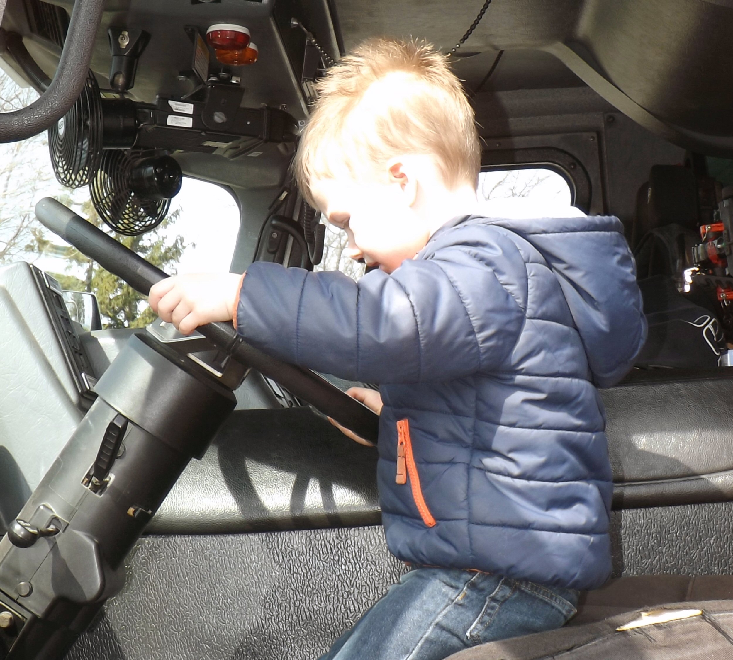 Callan gets comfortable in the driver’s seat of a fire truck.