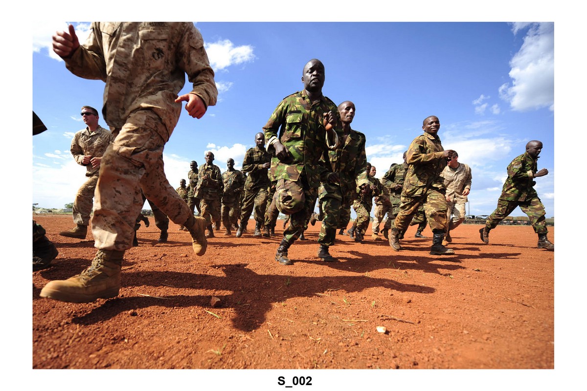Photo 2: American Marines and African military troops from Burundi, Kenya, Rwanda, Tanzania and Uganda together run to a site where non-lethal tactics were shared among militaries. (Photo by Air Force Senior Airman Christopher Griffin)