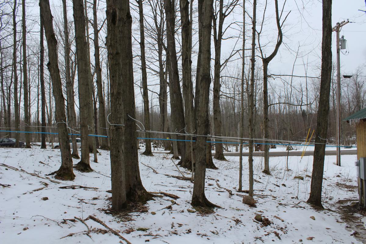 Pipes full of sap running into the sugar house to be made into syrup