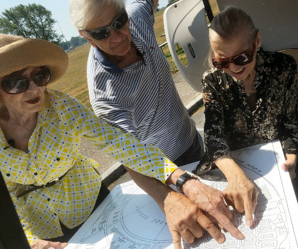 Ella and David Levi and Rikica Levi Giglio pointing towards living quarters of their families on a map of Fort Ontario from 1944 to 1946.