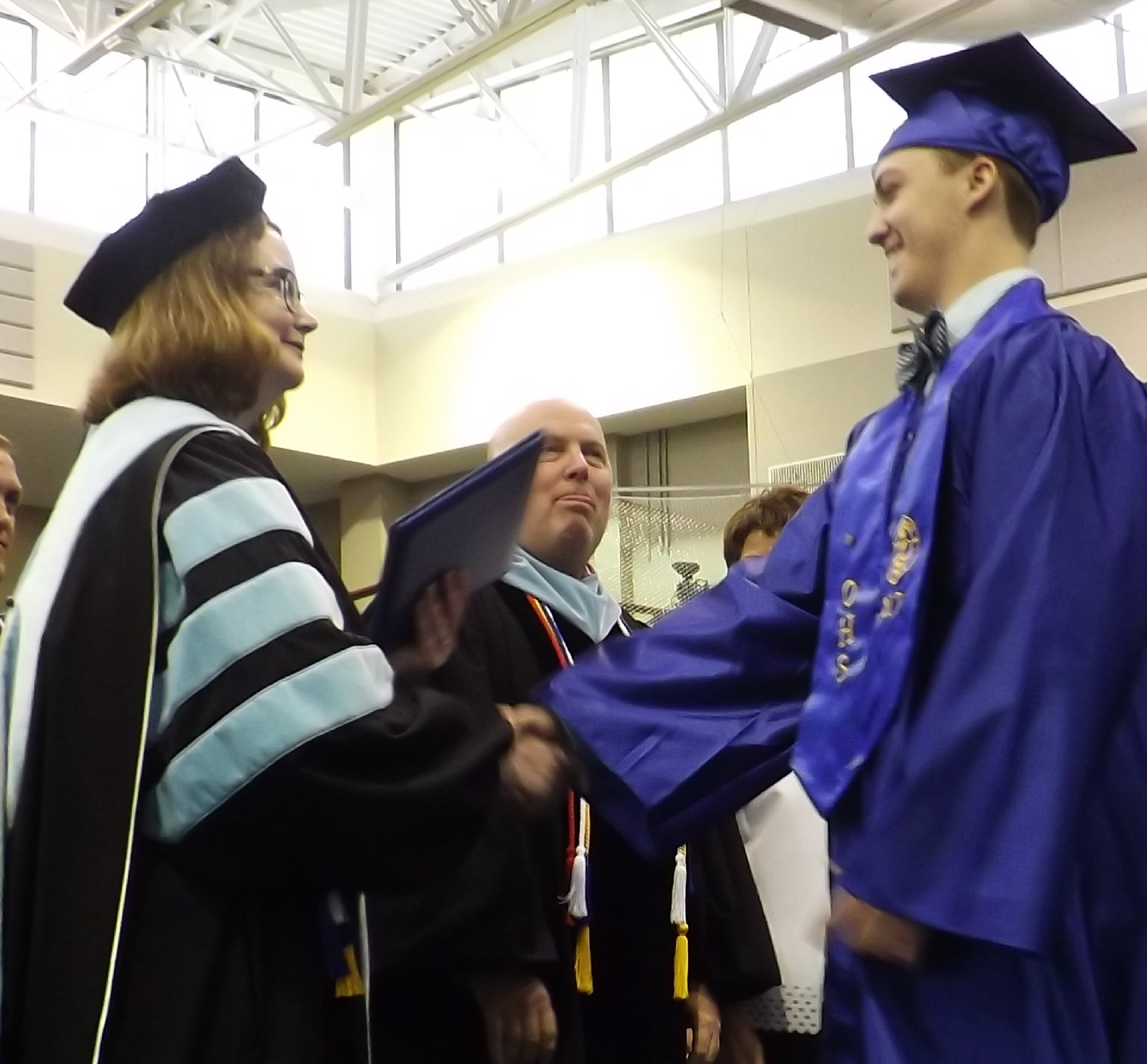 Mark Schuffenecker is congratulated by Principal Dr. Heidi Sweeney. Looking n is Superintendent Dr. Dean Goewey.