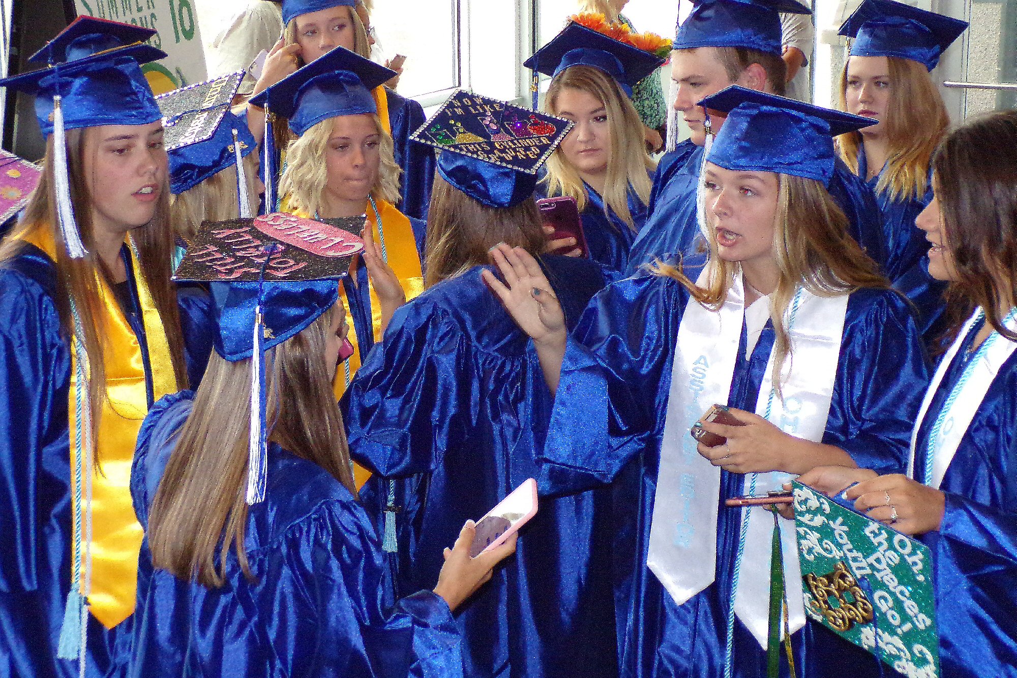 A group of friends gathers prior to the start of graduation.