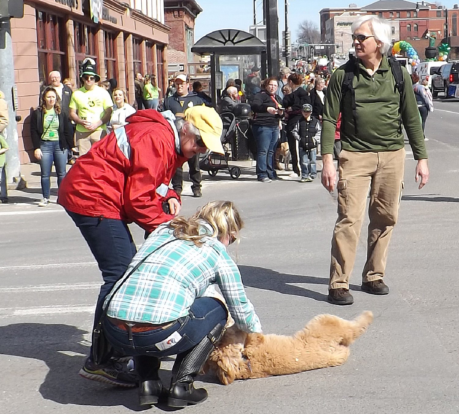 A canine member of the parade gets a welcomed belly rub along the parade route.