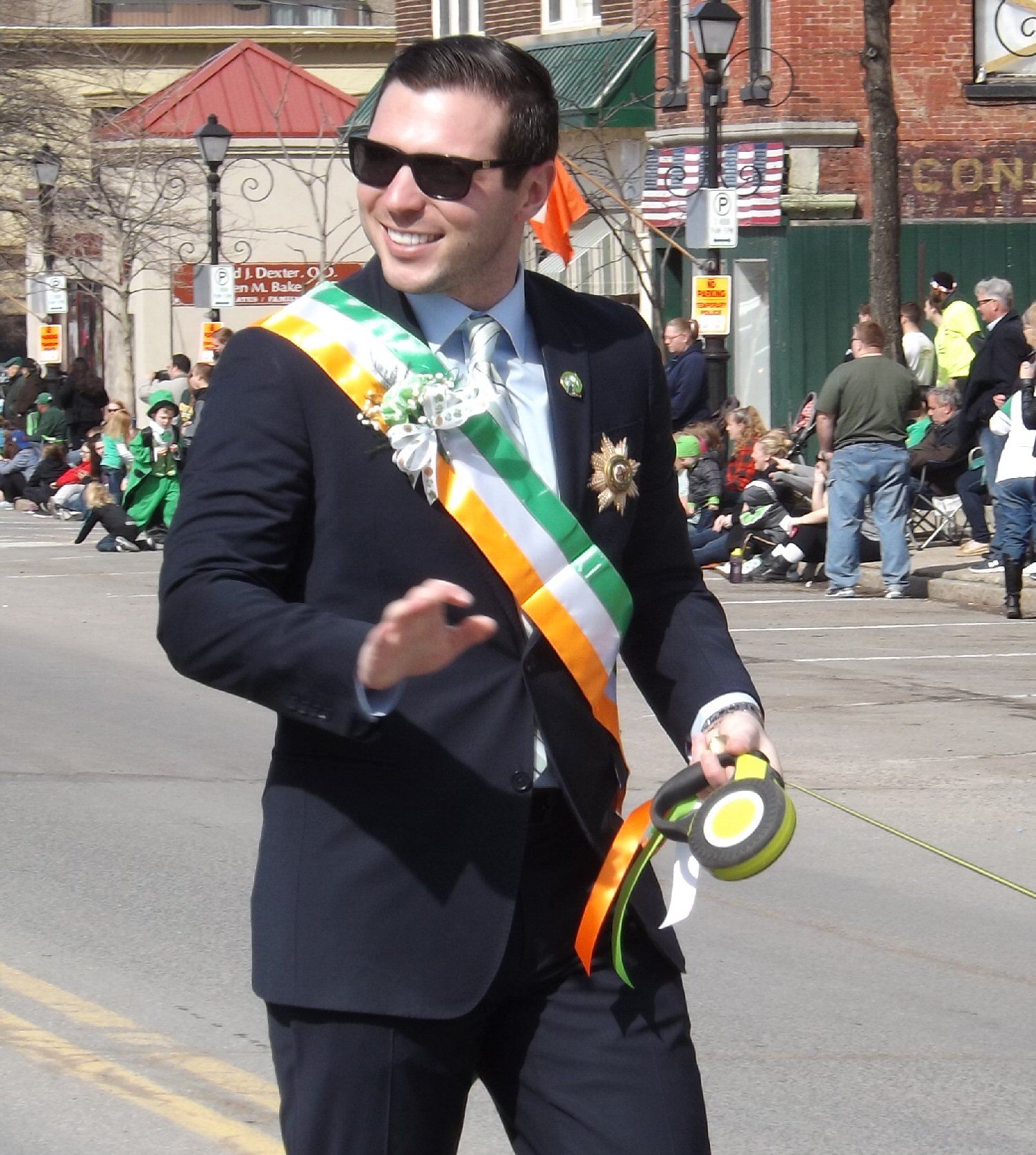 At West First and Bridge streets, Mayor William Barlow waves to some of the hundreds of people that came to view the parade