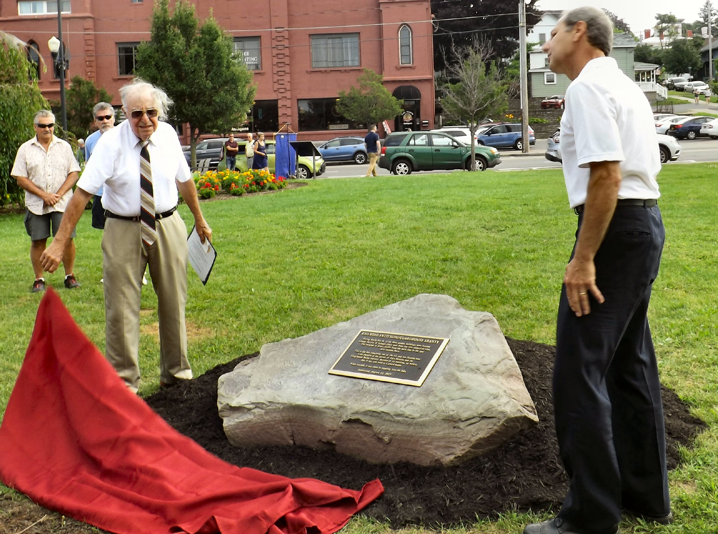 Tony Leotta and Robert Corradino unveile the plaque in front of the Guardhouse/Switching Shanty.
