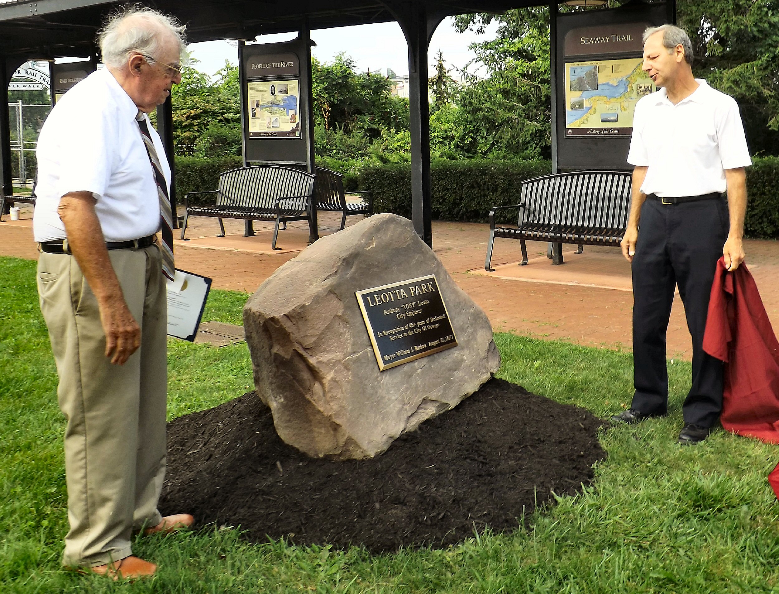 Councilor Robert Corradino reads the inscription on the plaque as Tony Leotta looks on.