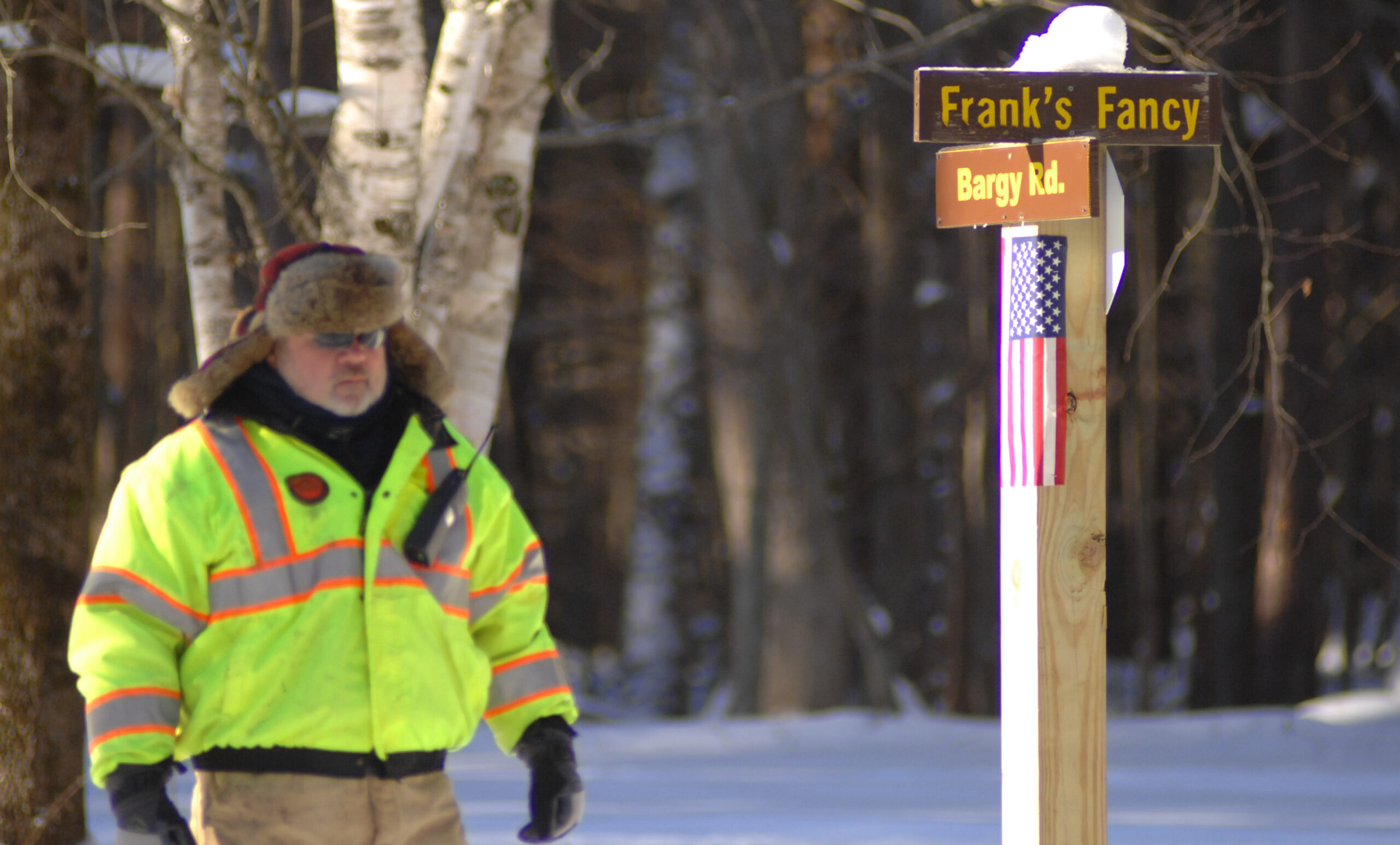 Volunteer Rob Drabot directs skiers at a trail intersection.