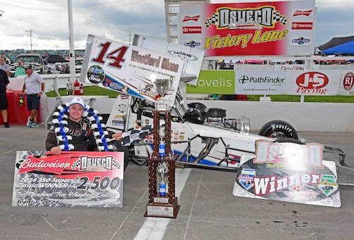 Jeffery Battle poses in Oswego Speedway Victory Lane after winning the 350 Super Classic.