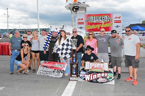 Jeffery Battle celebrates with family and crew after winning the Oswego Speedway 350 Super Classic.