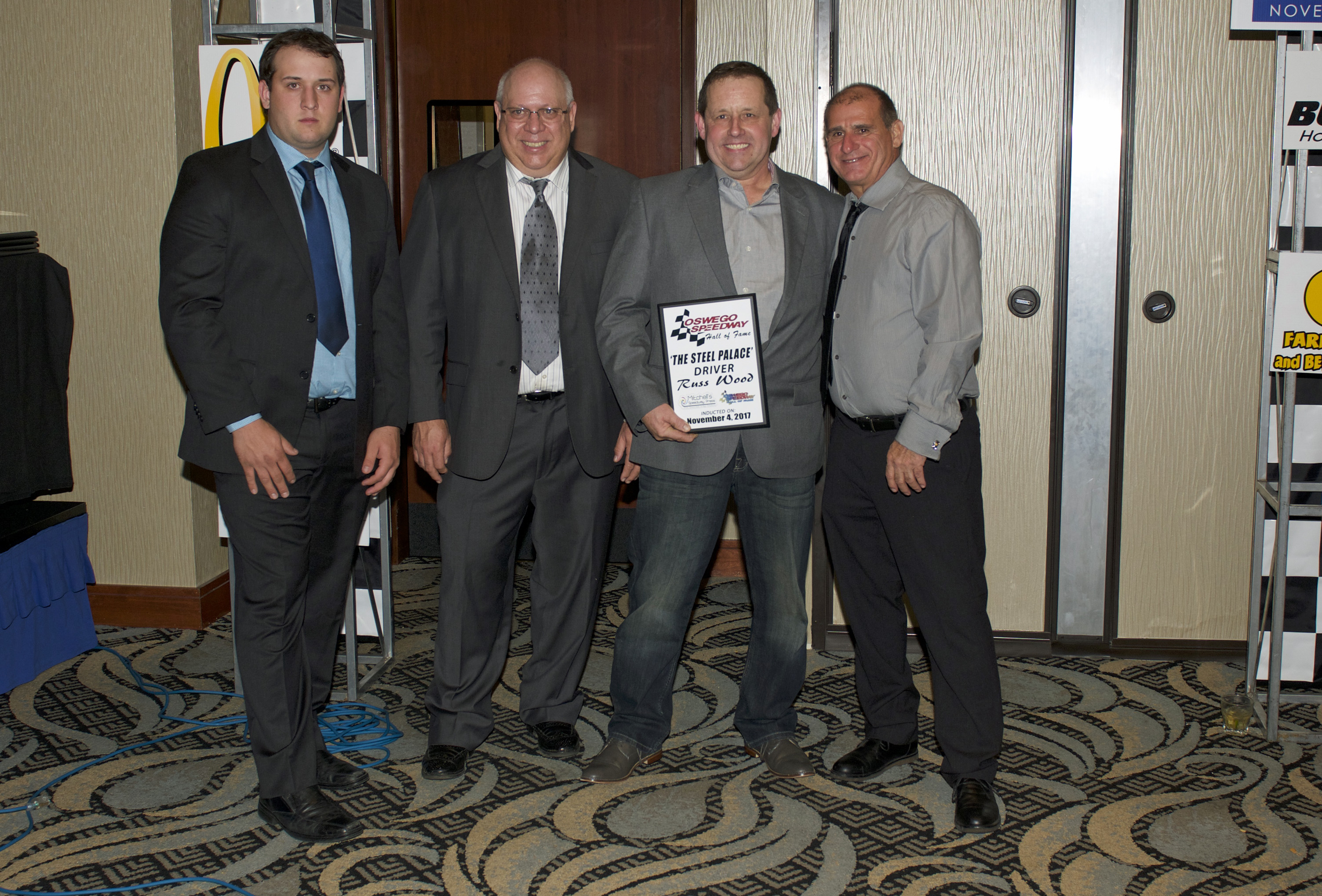 Inducted into the Oswego Speedway Hall of Fame as a Supermodified driver is Russ Wood. Presenting are Hall of Fame sponsor Mitchell’s Speedway Press reps Tyler and John Henry, left and track owner John Torrese, right.