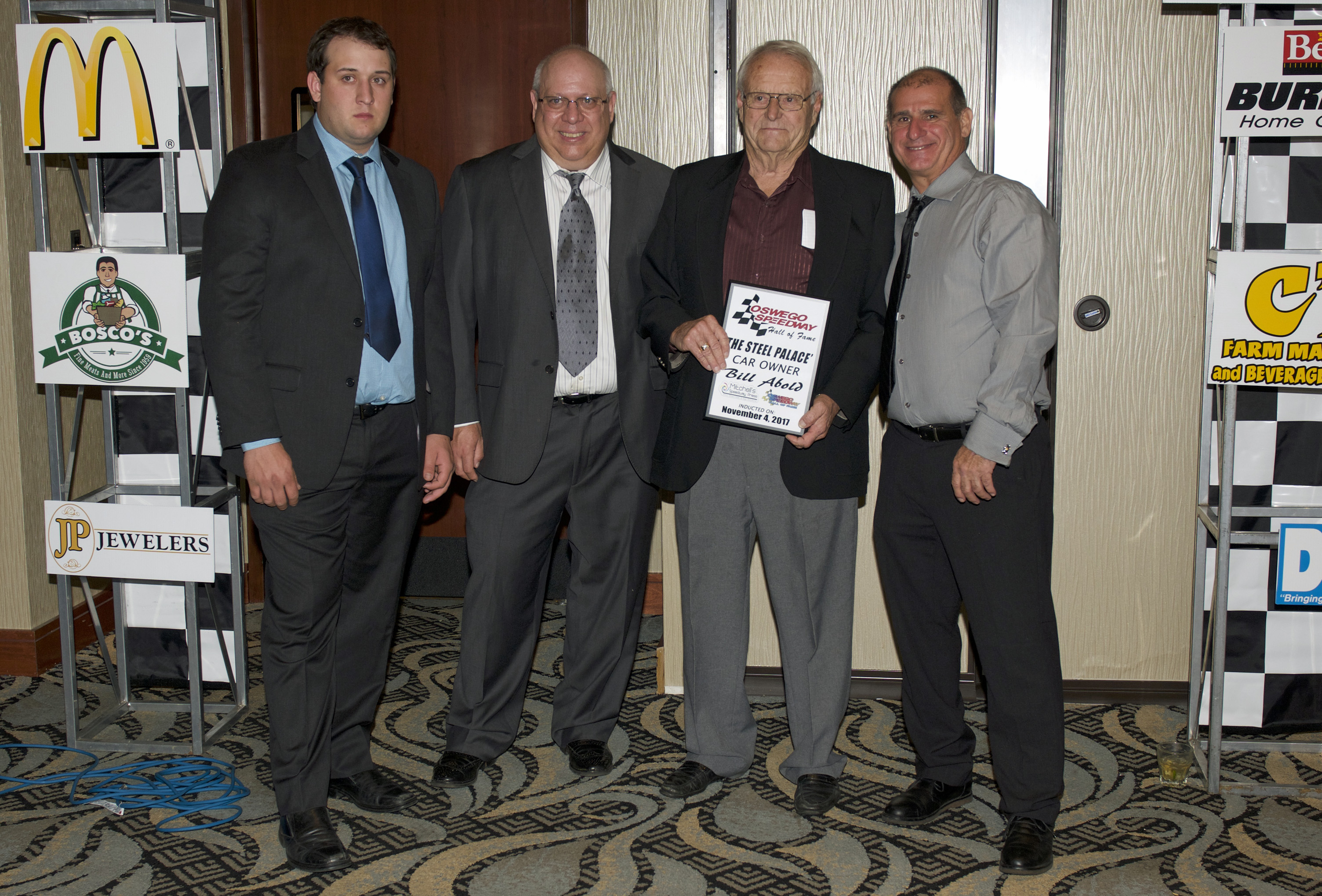 Inducted into the Oswego Speedway Hall of Fame as a car owner is Bill Abold. Presenting are Hall of Fame sponsor Mitchell’s Speedway Press reps Tyler and John Henry, left and track owner John Torrese, right.