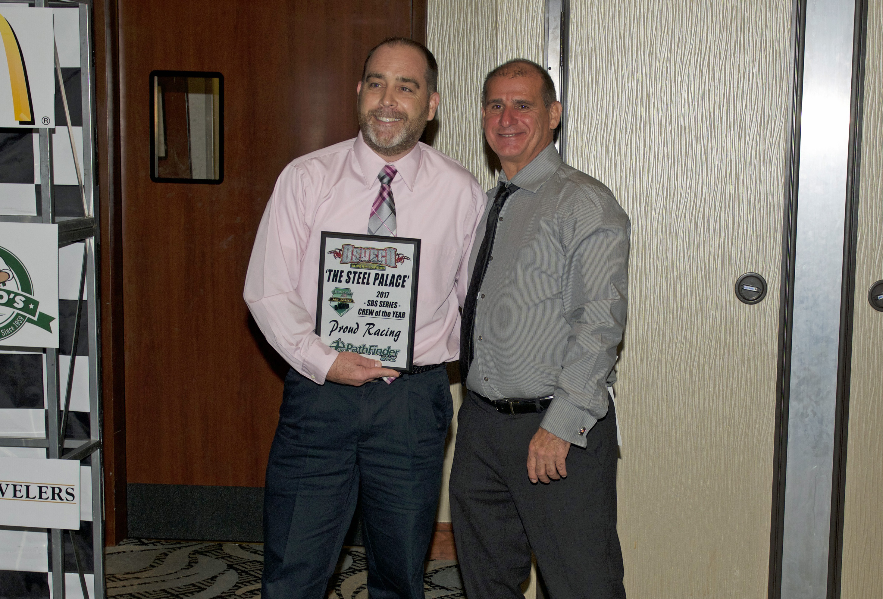 Oswego Speedway PathFinder Bank SBS Crew of the Year went to Proud Racing. Accepting is car owner Tim Proud. Presenting is John Torrese.