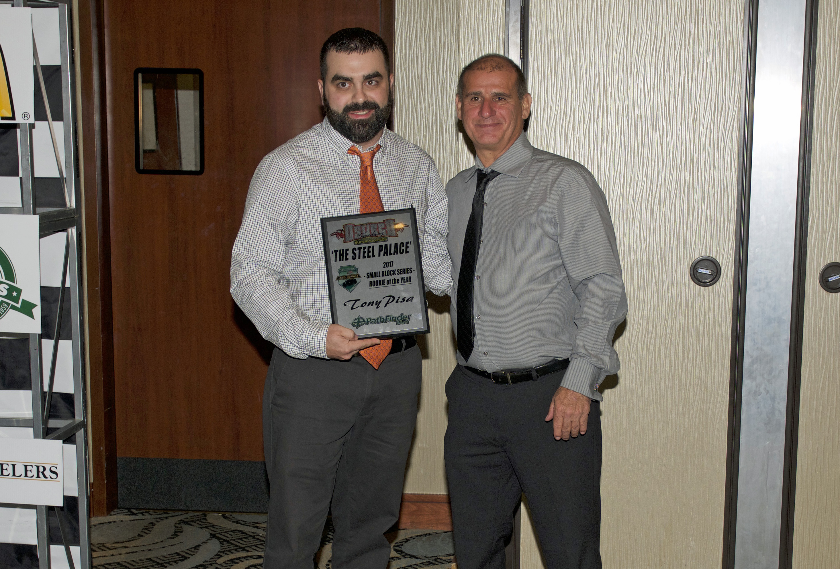 Oswego Speedway PathFinder Bank SBS Rookie of the Year went to Tony Pisa. Presenting is John Torrese.