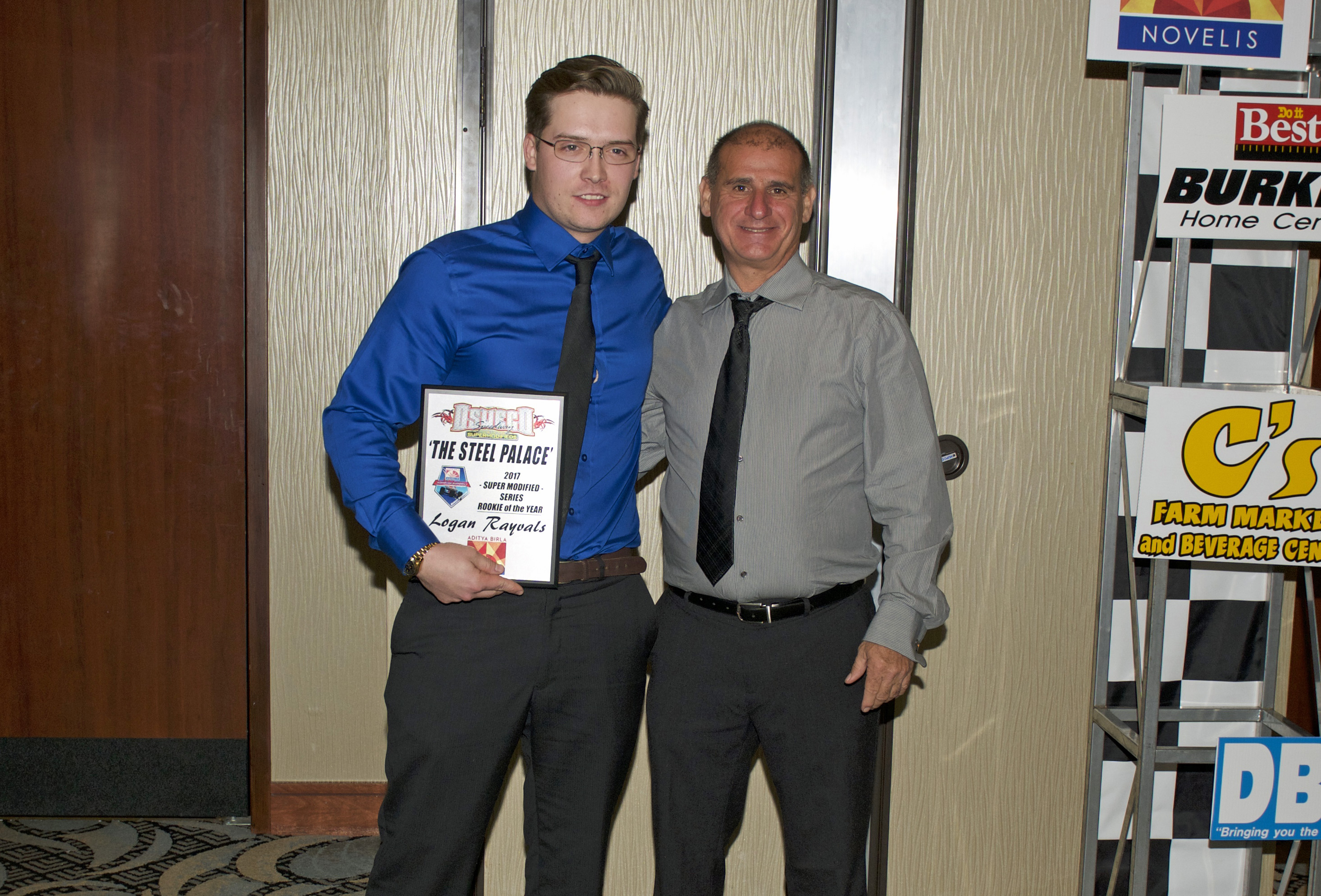 Oswego Speedway Novelis Supermodified Rookie of the Year went to Logan Rayvals. Presenting is John Torrese.