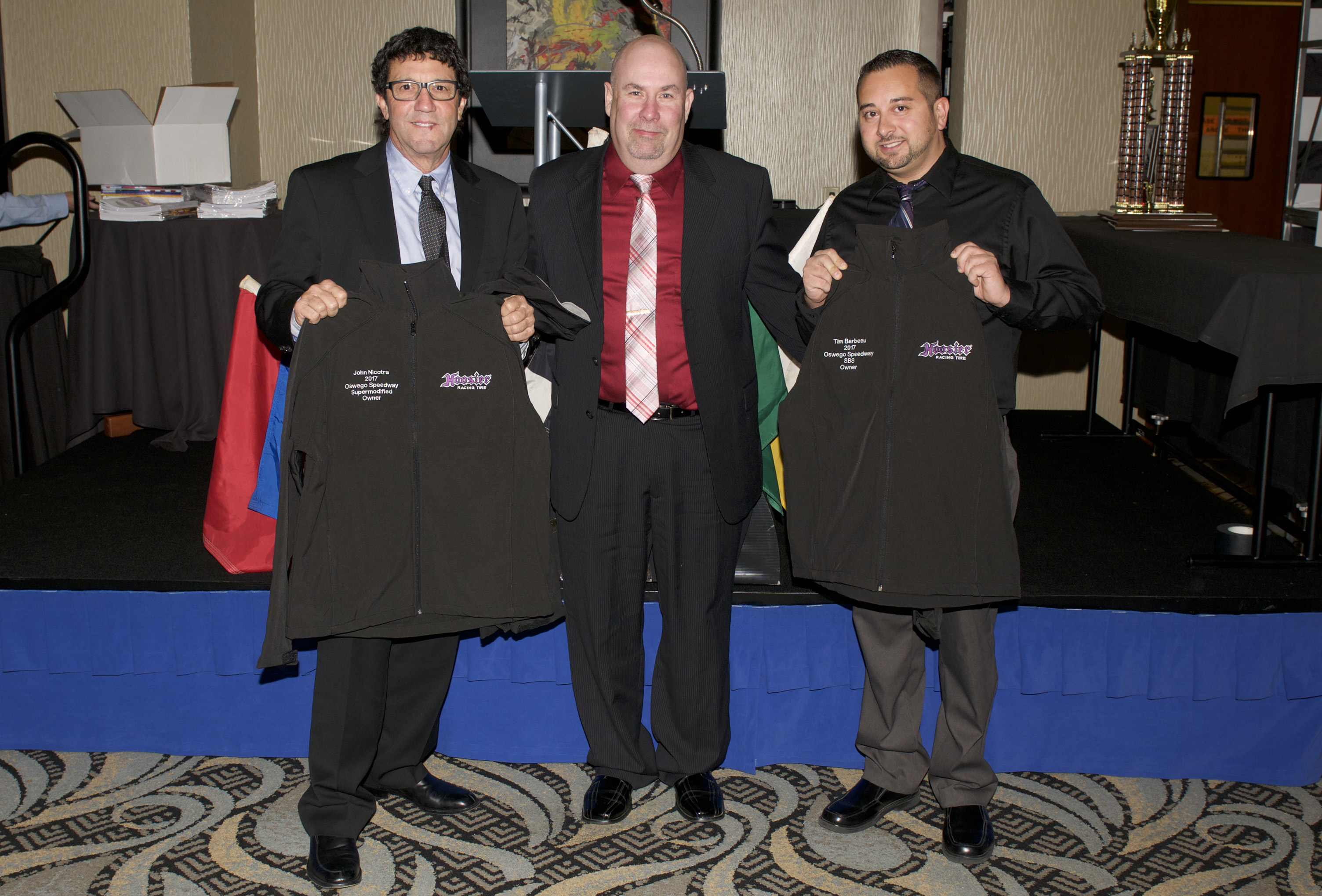 Oswego Speedway Track Championship Owners receive a jacket from Hoosier rep Mike Silliman. Pictured, from left, are John Nicotra Novelis Supermodified Champion Owner, Mike Silliman and PathFinder Bank SBS Champion Owner Tim Barbeau.