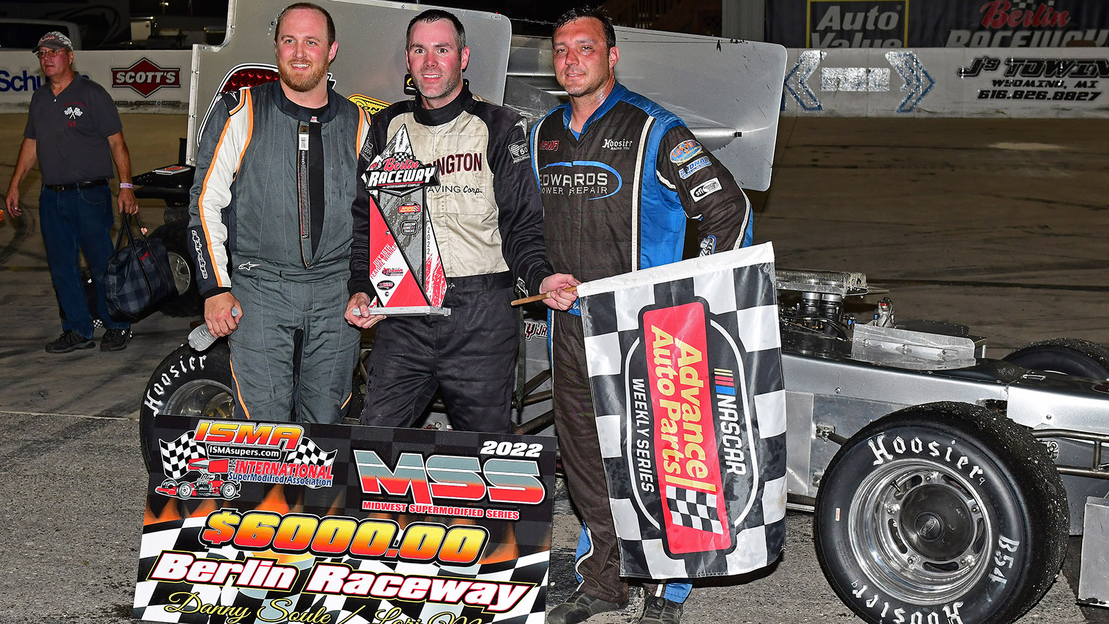 Top three for the ISMA/MSS feature at Berlin Raceway on Saturday were second place, Trent Stephens, winner Mike Ordway Jr and third Kyle Edwards.