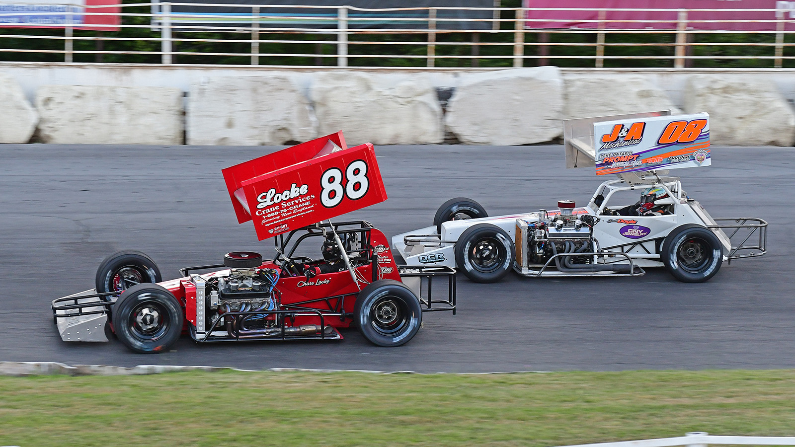 Chase Locke 88 won the battle with Dalton Doyle 08 for the race lead. He would go on to his second feature win at Oswego.