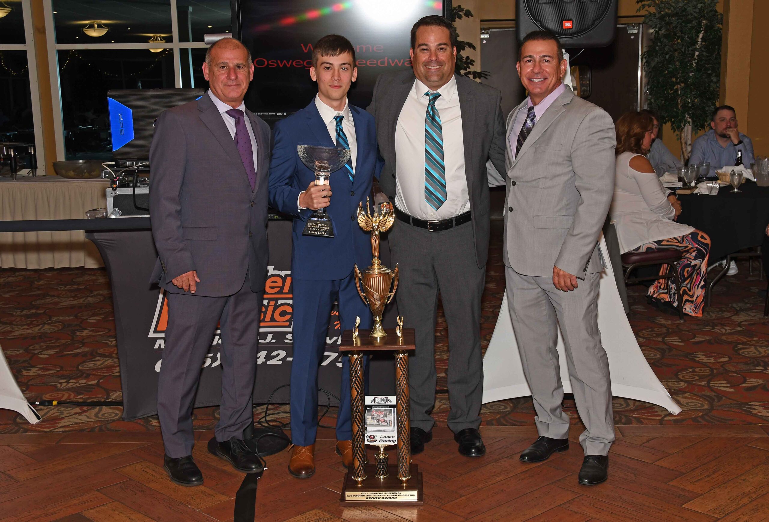 J&S Paving 350 Super Driver and Owner Track Champions, Chase Locke and Jeff Locke are presented trophies by track owner’s, John and Eric Torrese.