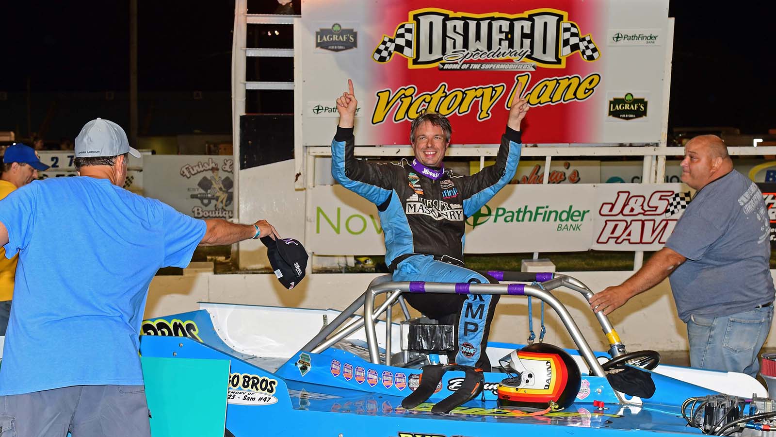 Dan Kapuscinski emerges from his car after winning the SBS feature at Oswego Speedway, as well as taking the 2022 SBS Track Championship.