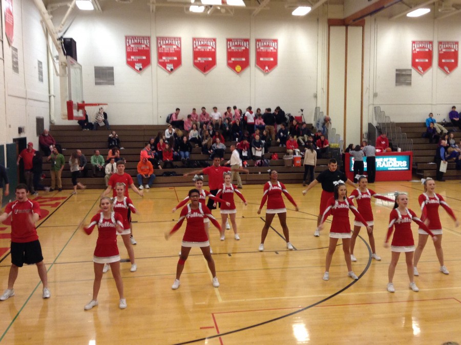 The Fulton Varsity Cheerleaders perform during half time of the boys and girls Varsity Basketball home openers.