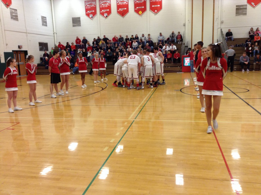 The Varsity Boys Basketball team huddles together before they tip off against Solvay, eventually winning 70-66.
